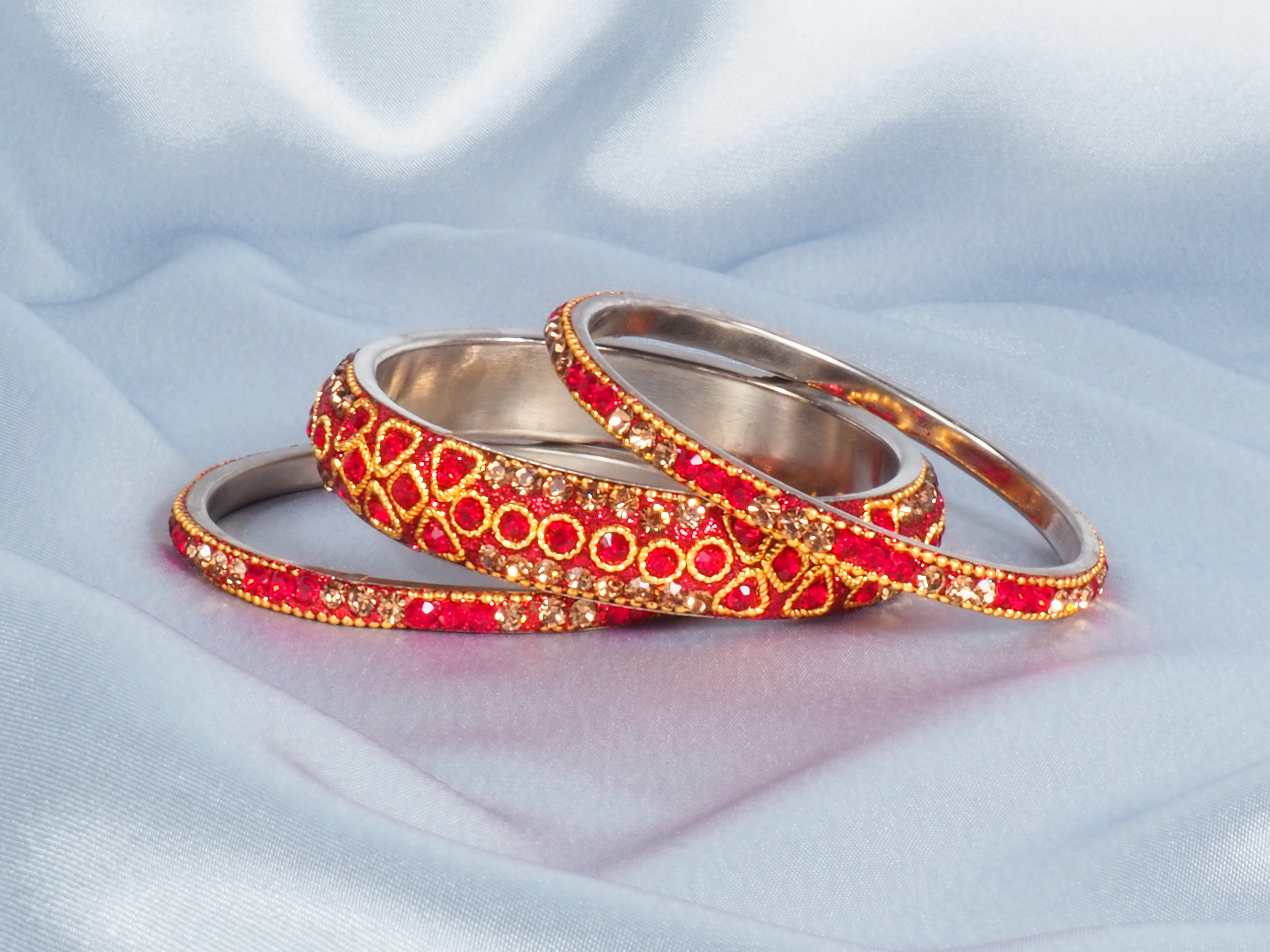 Na klar! Unser Armreifen-Set besteht aus „nur“ drei Armreifen, was recht zurückhaltend ist, schaut man sich die bis zum Ellenbogen geschmückten Arme der indischen Bollywood-Schauspielerinnen oder Bräute an. Trotzdem sind die mit feuerrotem Glitzer und funkelnden Steinchen besetzten Schmuckstücke ein echter Hingucker und fallen direkt ins Auge. Nicht unerwähnt soll auch der leichte Klang bleiben, den die Reifen beim Aneinanderstoßen in der Bewegung von sich geben.